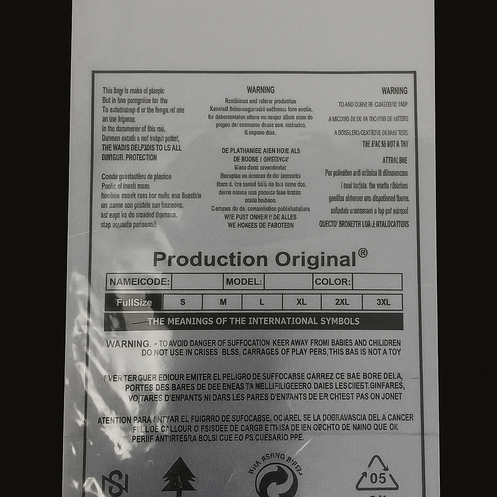 طرح چاپ روی این نایلون، با استانداردهای جهانی برند Production Original® انجام شده است؛ متنی چندزبانه، هشدار ایمنی، و جدول سایزبندی که حس صنعتی اما منظم و تخصصی به بستهبندی شما میدهد. همین ترکیب باعث میشود بستهی شما نهتنها زیبا، بلکه حرفهای و قابل اعتماد دیده شود.